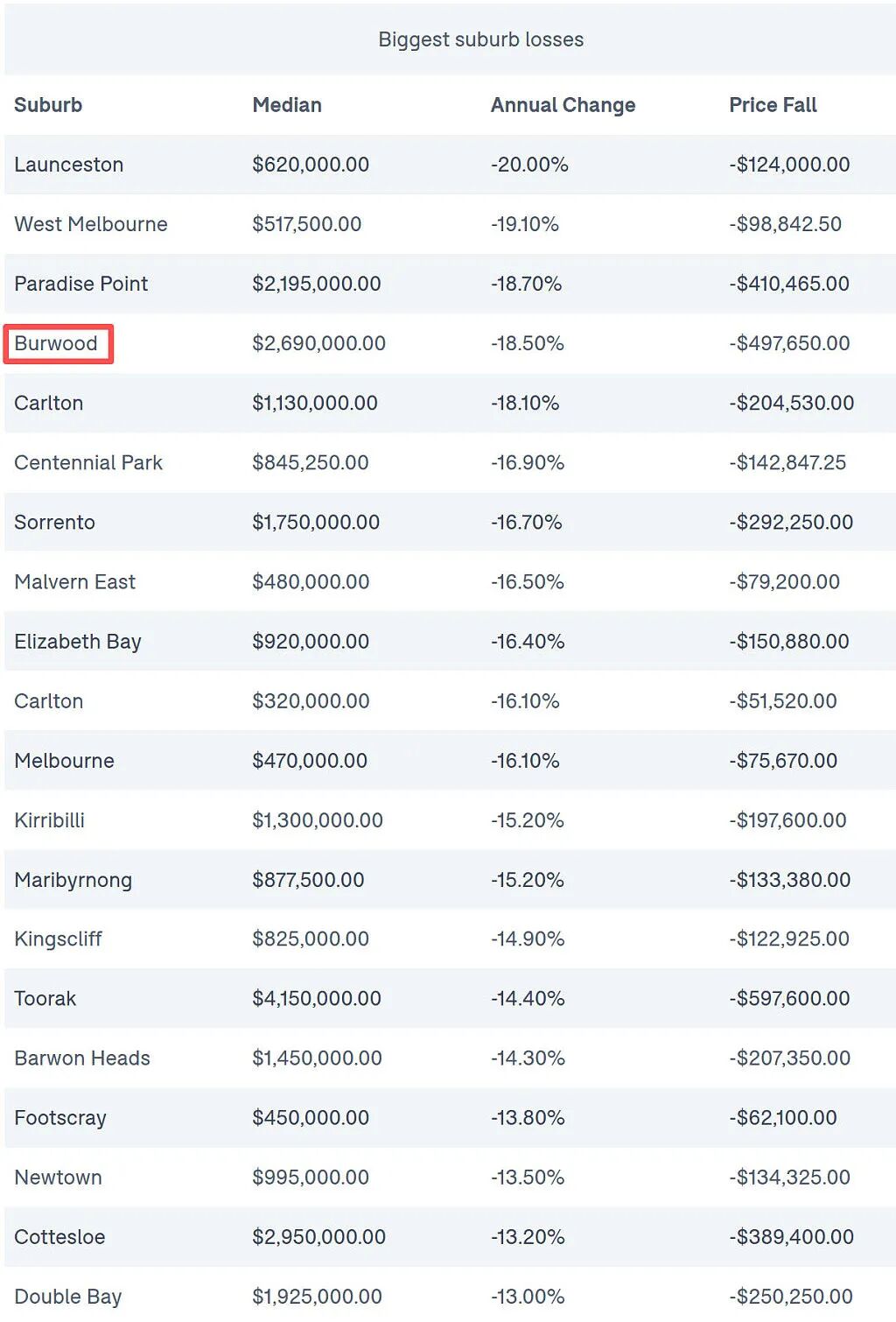 此外,刚刚被《Time Out》评为2025年澳洲最酷城区的悉尼华人重镇Burwood,房价中位数大跌了近50万澳元,跌幅达到18.5%,排名榜单第四。